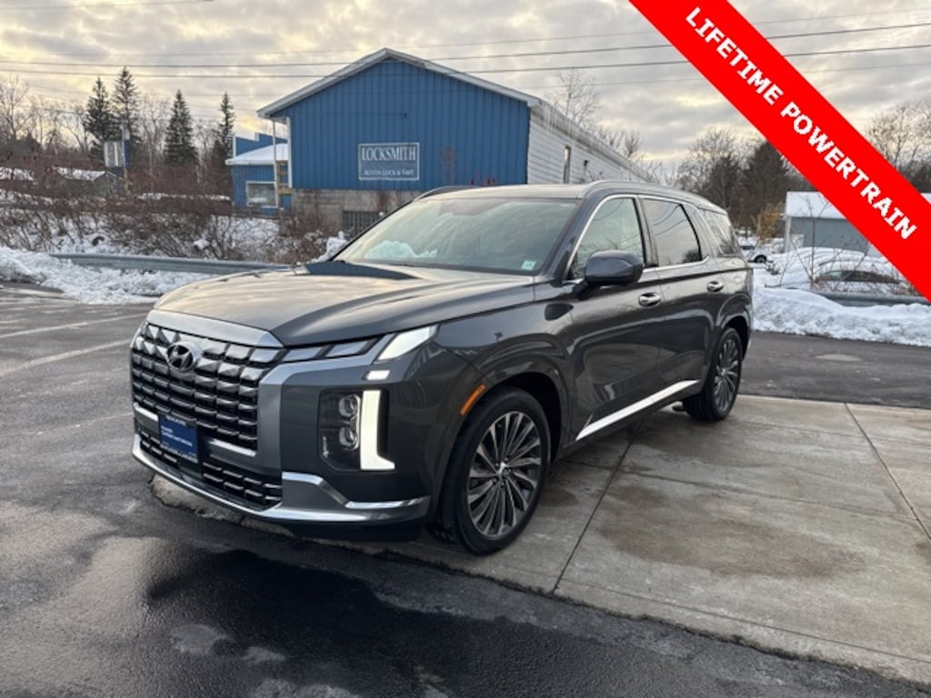 Palisade Calligraphy CERTIFIED, Hyundai Certified Used Vehicles Certified, V6, AWD, Steel Graphite, Navy/Beige Leather, Navigation System, Option Group 01, 12 Speakers, 3.648 Axle Ratio, 3rd row seats: split-bench, 4-Wheel Disc Brakes, ABS brakes, Air Conditioning, Alloy wheels, AM/FM radio: SiriusXM, Apple CarPlay & Android Auto, Auto High-beam Headlights, Auto-dimming door mirrors, Auto-dimming Rear-View mirror, Auto-leveling suspension, Automatic temperature control, Brake assist, Bumpers: body-color, Carpeted Floor Mats, Compass, Delay-off headlights, Driver door bin, Driver vanity mirror, Dual front impact airbags, Dual front side impact airbags, Electronic Stability Control, Emergency communication system, Exterior Parking Camera Rear, Four wheel independent suspension, Front anti-roll bar, Front Bucket Seats, Front Center Armrest, Front dual zone A/C, Front reading lights, Fully automatic headlights, Garage door transmitter: HomeLink, harman/kardon® Speakers, Heads-Up Display, Heated & Ventilated Front Bucket Seats, Heated door mirrors, Heated front seats, Heated rear seats, Heated steering wheel, Illuminated entry, Knee airbag, Low tire pressure warning, Memory seat, Occupant sensing airbag, Outside temperature display, Overhead airbag, Overhead console, Panic alarm, Passenger door bin, Passenger vanity mirror, Power door mirrors, Power driver seat, Power Liftgate, Power moonroof, Power passenger seat, Power steering, Power windows, Premium Nappa Leather Seat Trim, Radio data system, Radio: AM/FM/MP3 Premium Audio System, Rain sensing wipers, Rear air conditioning, Rear anti-roll bar, Rear audio controls, Rear reading lights, Rear side impact airbag, Rear window defroster, Rear window wiper, Reclining 3rd row seat, Remote keyless entry, Security system, Speed control, Speed-sensing steering, Split folding rear seat, Spoiler, Steering wheel mounted audio controls, Tachometer, Telescoping steering wheel, Tilt steering wheel, Traction control, Trip computer, Turn signal indicator mirrors, Variably intermittent wipers, Ventilated front seats, Ventilated rear seats, Wheels: 20" x 7.5J Calligraphy Exclusive Alloy, Palisade Calligraphy CERTIFIED, V6, AWD, Steel Graphite, Navy/Beige Leather, Navigation System, Option Group 01.