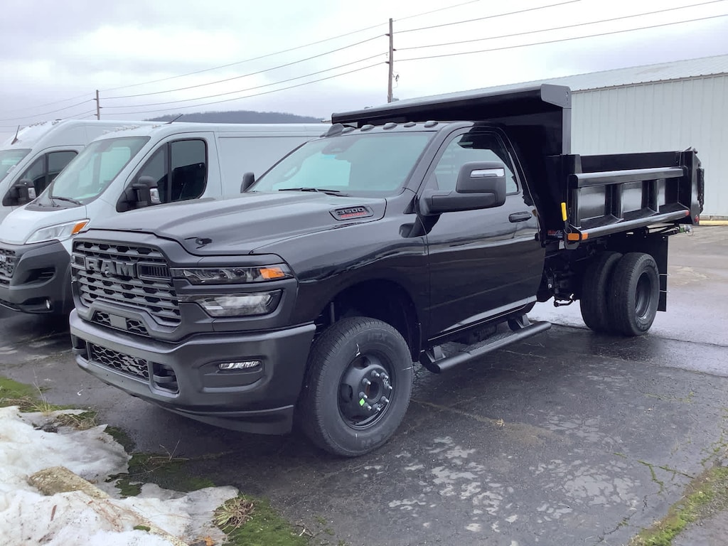Tradesman trim w/ 9 AIR-FLO Dump Body Diamond Black Crystal Pearlcoat exterior and Diesel Gray/Black interior. Apple CarPlay®, Keyless Start, Onboard Communications System, iPod/MP3 Input, 4WD, DUAL REAR WHEELS, BLACK TUBULAR SIDE STEPS.