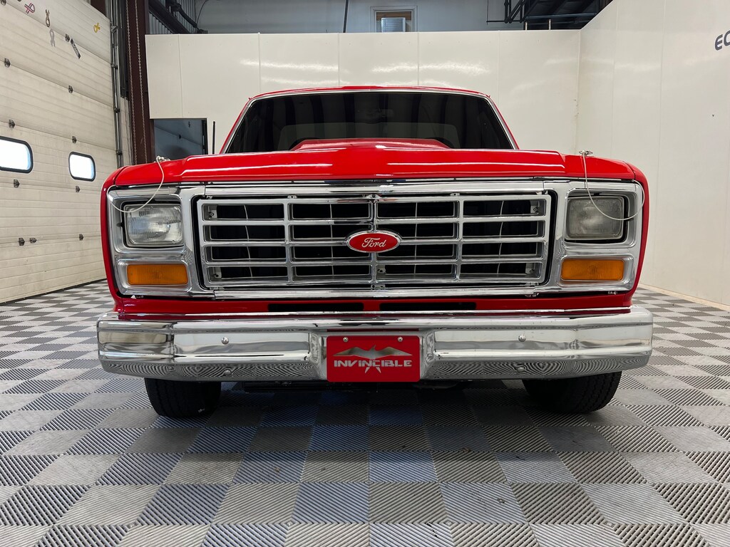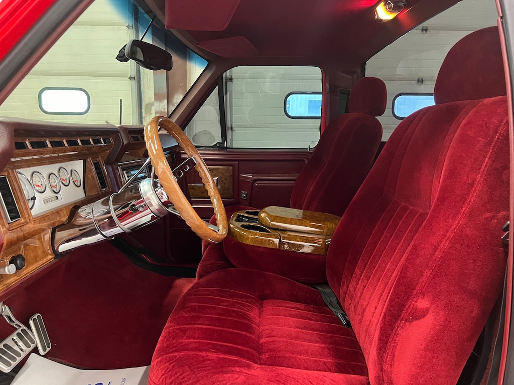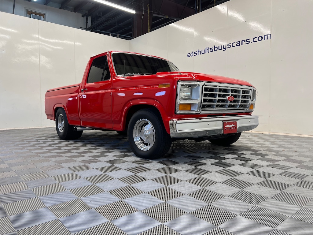 This 1983 Ford F-100 regular cab pickup was modified in 2010 with the installation of a bored and stroked 557ci V8 that also features Trick Flow cylinder heads, a Comp Cams roller camshaft, and a Holley 750-cfm carburetor. The truck was also repainted red and received a tubbed cargo bed during the build. It is also equipped with a three-speed automatic transmission, red cloth upholstery, a fiberglass cowl induction hood, side exhaust outlets, an A.R.E. tonneau cover, 16-inch Center Line wheels, custom interior woodgrain trim, AutoMeter gauges, air conditioning, and a Pioneer stereo. The truck previously spent time in Florida and was purchased by the seller in 2023. The truck was refinished in red under prior ownership and features a tubbed Styleside bed as well as a replacement chrome front bumper, a chrome grille, a red Ford oval badge, barbed-wire striping, a fiberglass cowl induction hood with hood pins, tinted windows, dual fuel tanks, and an A.R.E. tonneau cover. Polished 16-inch Center Line wheels are mounted with 225/70 General Grabber All Season tires up front and 31Ã?10-inch Mickey Thompson Sportsman tires at the rear. The truck is said to be equipped with a four-link suspension, and braking is handled by power-assisted discs at all four corners. The cab features seating trimmed in red cloth along with a color-coordinated headliner, carpeting, and door panels. Amenities include a center console, power windows and locks, air conditioning, a heater, a replacement rearview mirror, a Pioneer stereo, and coordinated woodgrain trim on the dash, center armrest, and aftermarket steering wheel. Replacement AutoMeter gauges are set in a white surround and consist of a 120-mph speedometer and readouts for coolant temperature, oil pressure, voltage, and fuel level. The digital odometer shows 2,300 miles, approximately 500 of which were added under current ownership. True mileage is unknown. Work in 2010 included sourcing a 460ci Ford V8 block, which was bored .080 inch over and stroked to a displacement of 557ci. Components include Trick Flow cylinder heads, a Comp Cams roller camshaft, hydraulic lifters, MSD ignition, and an Edelbrock intake manifold topped by a Holley 750-cfm race carburetor with a mechanical secondary. The stainless steel 3-inch exhaust system incorporates Hedman headers and side exits. Power is sent to the rear wheels via a three-speed automatic transmission and a 9-inch rear end with 3.50:1 gears. The Carfax report shows no accidents or other damage and lists history in Florida with entries beginning in 1991.